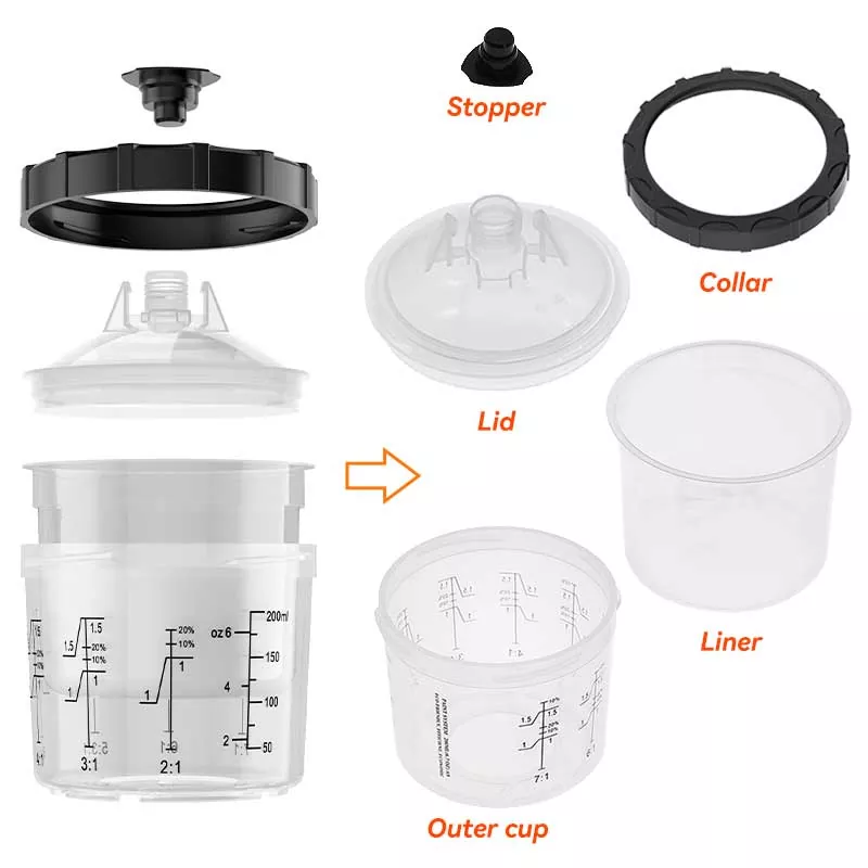 Dette 200ML disponible malingskoppsystemet 1.0 erstatter i utgangspunktet den tradisjonelle gravitasjonskoppen fordi den ikke bare sparer mer maling, men også forbedrer malingseffektiviteten. Nærmere bestemt, den utsøkte utformingen av den automatiske spiralen av foringen ved maling gjør at malingen blir fullt utnyttet; i mellomtiden unngår designen med hurtiglåsing pluss utskifting av foring å vaske koppen, slik at malejobben kan utføres effektivt og gjentatte ganger. Vi har adaptere for nesten alle merker sprøytepistoler på markedet for å møte erfaringsbehovene til forskjellige sprøytepistolentusiaster. Adapteren er laget av rustfritt stål, som er motstandsdyktig mot malingskorrosjon og meget slitesterk. Den tette kombinasjonen av foringen med lokket sikrer at koppsystemet ikke lekker maling under maling, og støtter langtidslagring av ubrukt maling for å unngå sløsing.