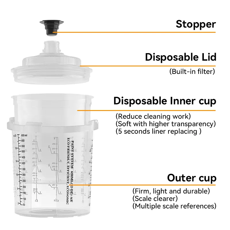 Sammenlignet med den tradisjonelle 1.0-serien, har AYS3.1 engangsspray pistol kopp en forbedret ytre koppdesign med et ekstra utskåret vindu, slik at sprøyter enkelt kan overvåke malingen inne i koppen. Den integrerte låsedesignet forenkler koppendringer og forbedrer sprayens effektivitet betydelig.