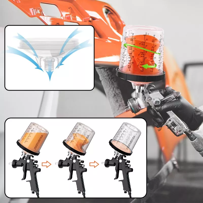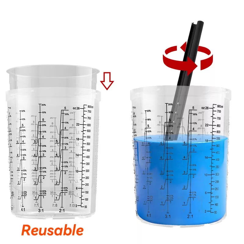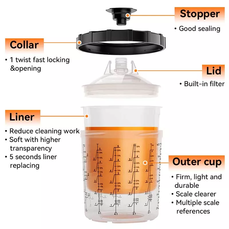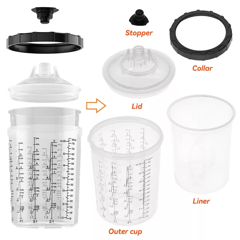 800ML Disposable Paint Cup System 1.0 rommer 28,5 fl oz (850 ml) maling ,den er ideell for 4-panels reparasjoner eller eller mindre av materialer, inkludert store partier med klarlakk. Denne serien er utviklet for å forbedre arbeidseffektiviteten og spraykvaliteten for å møte forventningene til alle engangssprayer. kopper fordi det gjør sprøyteprosessen renere og mer effektiv. Maling kan blandes direkte i spraykoppen, og kun minimal opprydding er nødvendig etter hver bruk. Hvis du ønsker å engros engangs sprøytepistolkopp, vennligst kontakt oss for å få gratis prøver for testing.