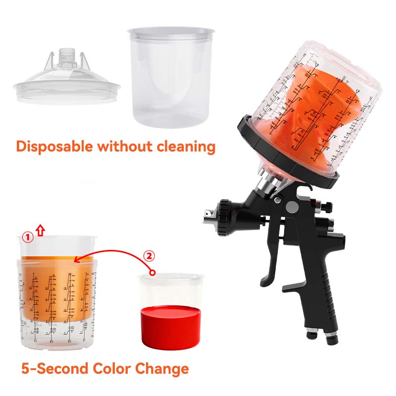 Deengangs sprøytepistolkopp krever ingen rengjøring etter bruk; bare kast innerkoppen for raskt å endre farger, redusere fargeskiftintervallet fra 20 minutter til 5 sekunder, og effektivt doble den daglige produksjonen. Lokket har et innebygd finfilter for effektivt å filtrere urenheter, noe som sikrer en jevn og jevn spray, noe som resulterer i en finish av høyere kvalitet.