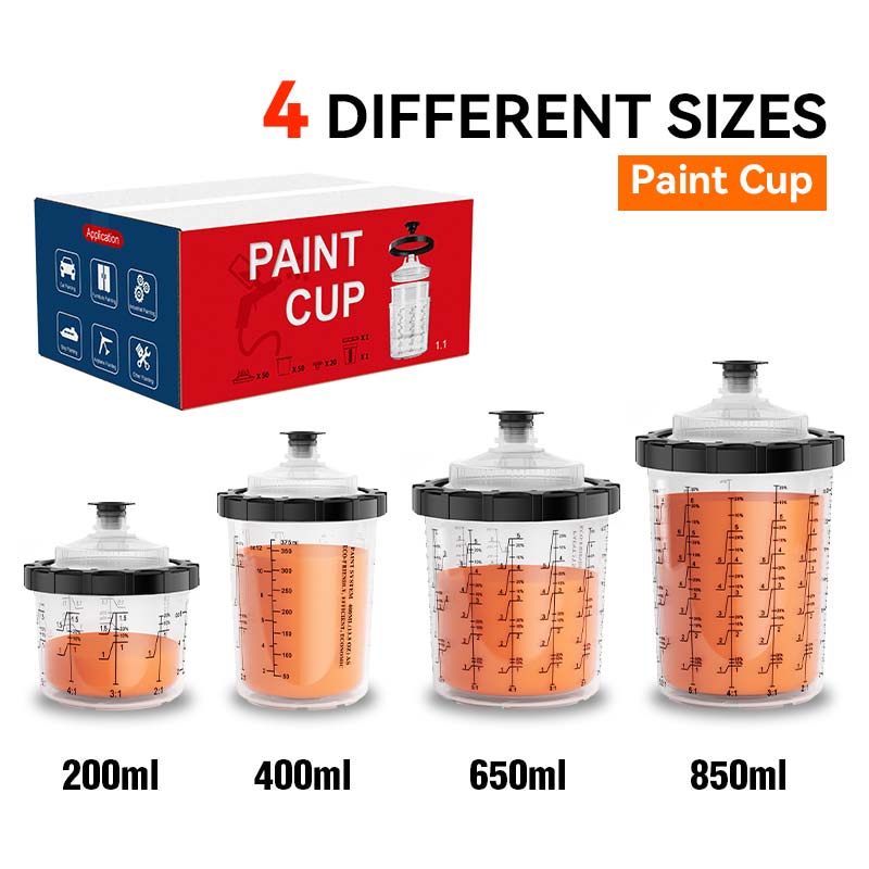 Basert på markedsundersøkelser er malingskoppen tilgjengelig i fire kapasitetsspesifikasjoner: 200 ml, 400 ml, 650 ml og 850 ml, catering til forskjellige bruksscenarier, enten det er for spraying av store områder eller detaljerte touch-ups. I tillegg har den indre koppstrukturen blitt optimalisert for å sikre jevn maling, og redusere tilstopping og avfall.