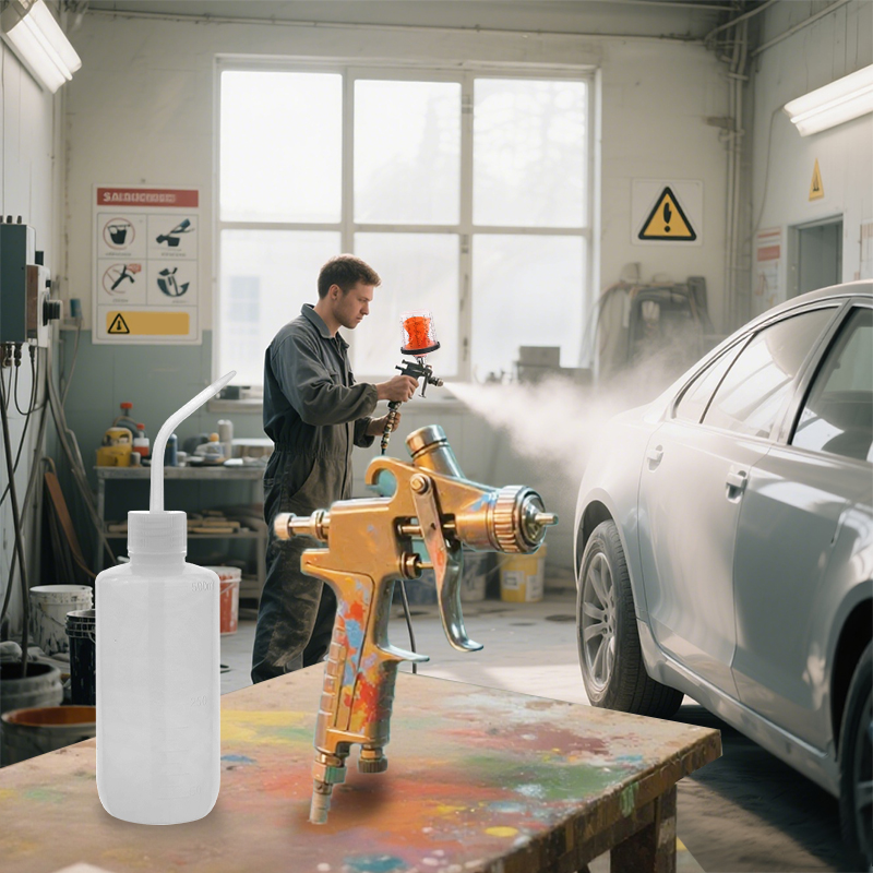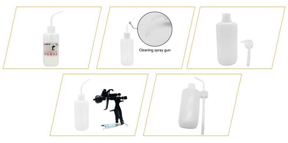 AYSPAT spraypistol vaskepotte er et effektivt spraypistol rengjøringsverktøy med utmerket renseeffekt. Den kan raskt skylle malingen som er igjen i sprøytepistolen, noe som bedre kan beskytte presisjonsdelene inne i sprøytepistolen. Spraypistolen er enkel å betjene, og væskestrømmens intensitet og retning kan kontrolleres nøyaktig ved å klemme på flaskekroppen. Etter malingsoperasjonen, bruk pistolvaskekaret til å fylle løsemiddelet for å skylle flekkene på de komplekse rørene inne i sprøytepistolen, noe som kan opprettholde sprøytepistolen og forlenge levetiden betydelig. Pistolvaskeflasken er laget av mykt og lett PP-materiale, som er motstandsdyktig mot korrosjon av løsemidler som aceton og toluen. Det er en ideell løsning for vedlikehold av sprøytepistolen.